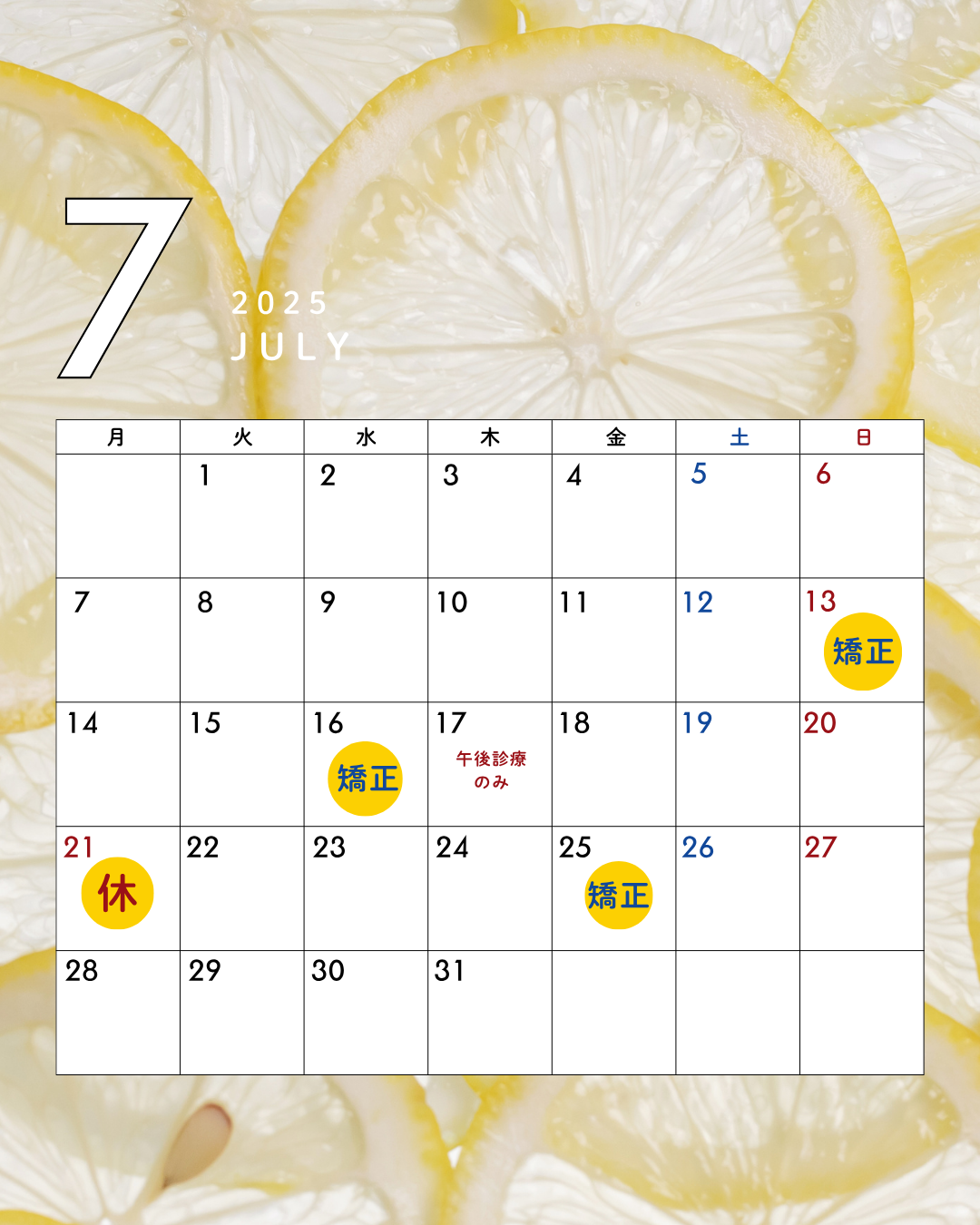 7月の休診日と矯正治療および歯並び無料相談の日程をお知らせいたします。