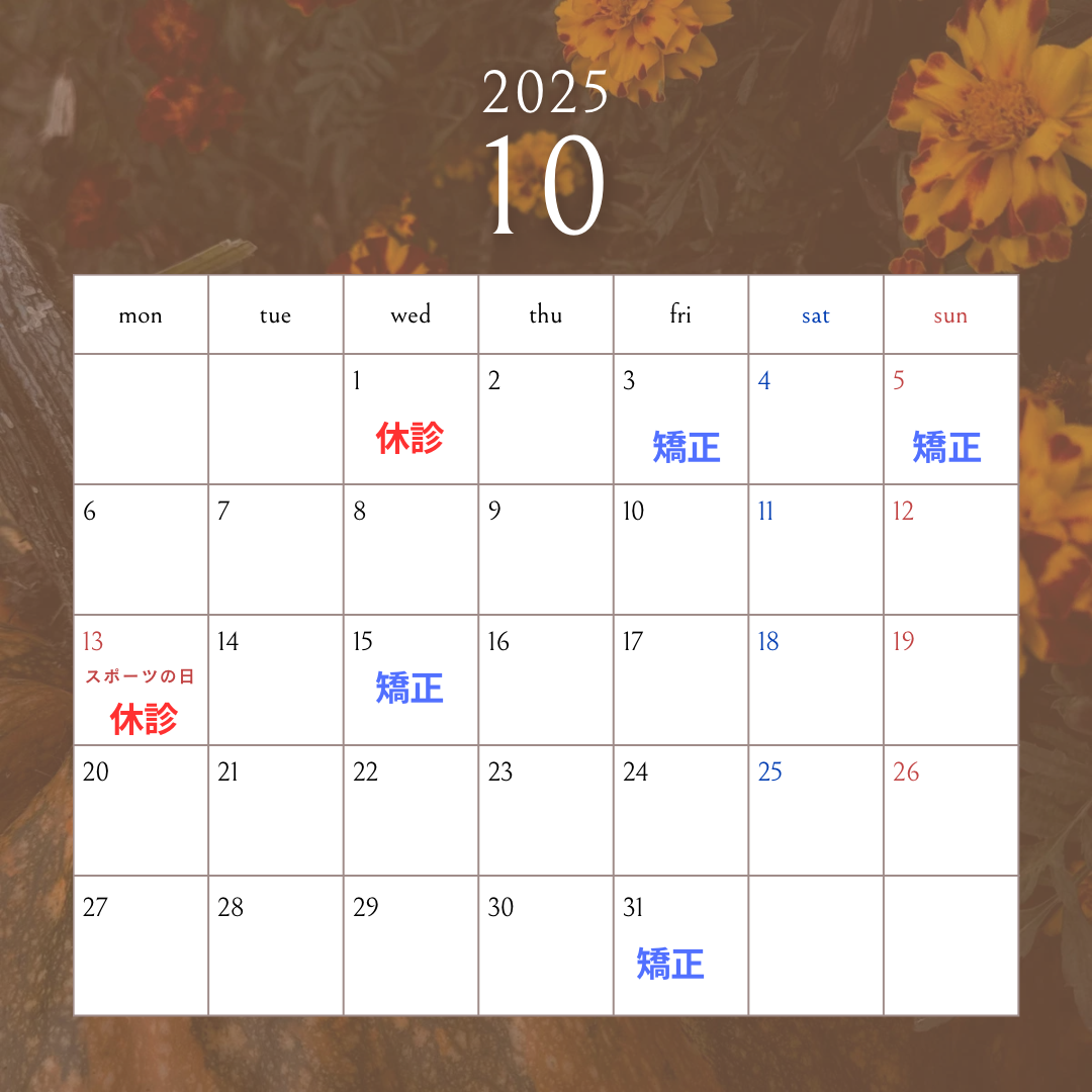 10月の休診日と矯正治療および歯並び無料相談の日程をお知らせいたします。