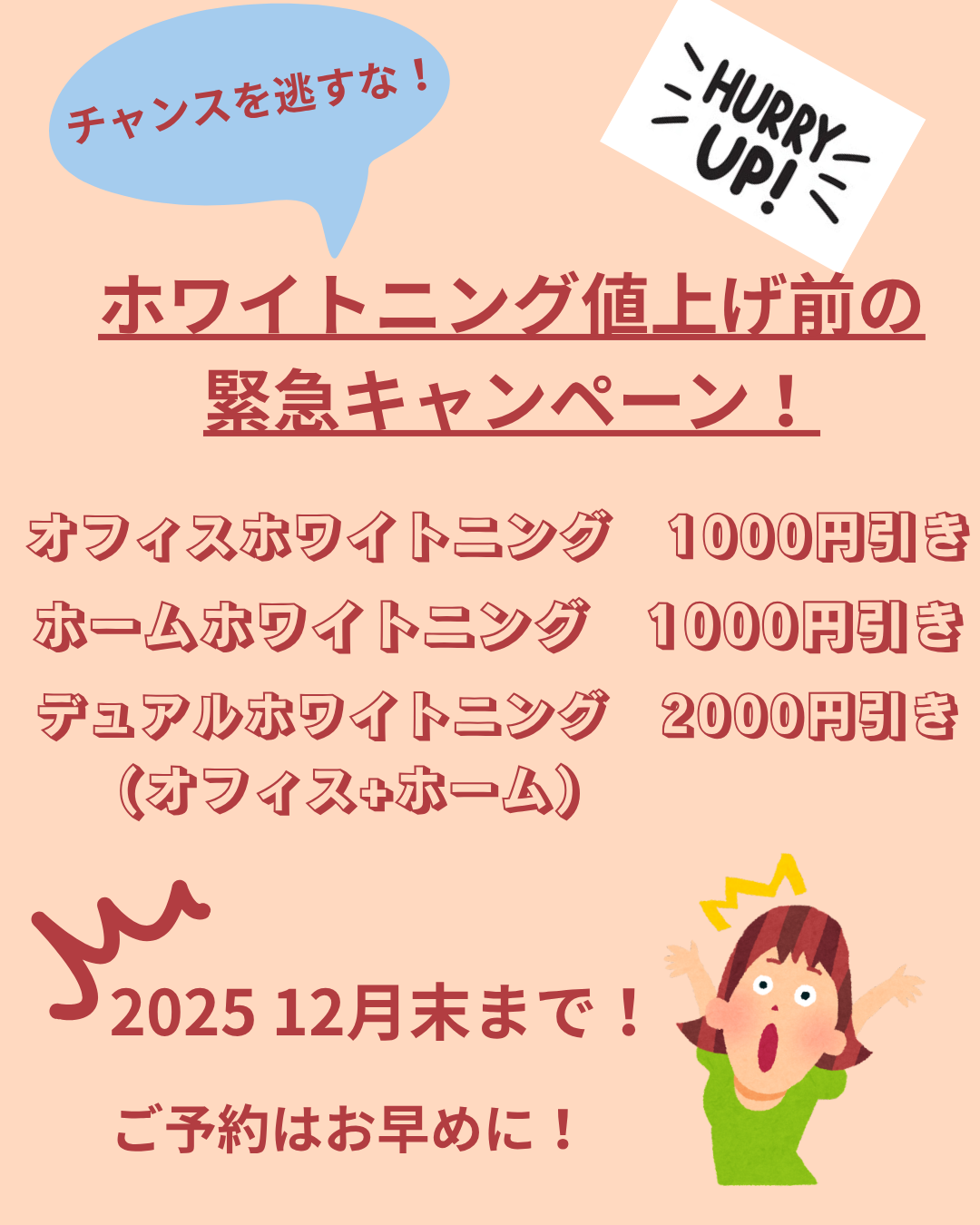 値上げ前のホワイトニング緊急キャンペーン開催中!